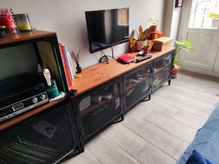 Conjunto de mueble de TV y estantería de estilo industrial. - Diseño con estructura metálica negra. - Tableros de madera en tono natural. - Puertas con rejilla metálica. - Múltiples compartimentos de almacenaje. Mueble de tv medidas: 150x36x54cm Estanteria medidas: