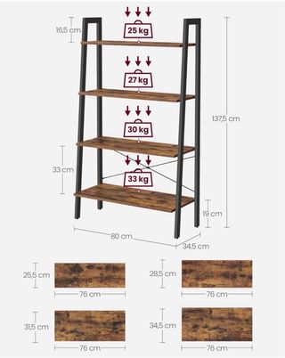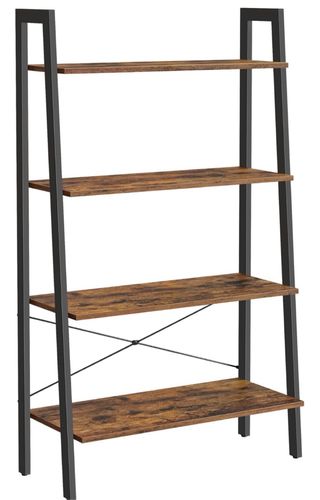 Estantería de estilo industrial con un diseño de escalera. - Estructura de metal negro. - Estantes de madera con acabado rústico. - Montaje sencillo.