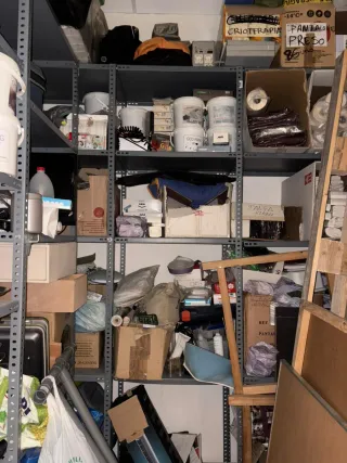 Estanteria Multistrux plateada y blanca pero la estructura metálica está pintada con pintura negra al agua. Se puede eliminar con esponjilla hilo acero típica de cocina (nanas). En la parte frontal se puede ver que una parte ya se ha eliminado. Las tablas están sueltas y habría que pintarlas y volverlas a colocar. Algunos de los agarres de las tablas están doblados o no los tiene pero para alguien que sea manitas no creo que haya problema