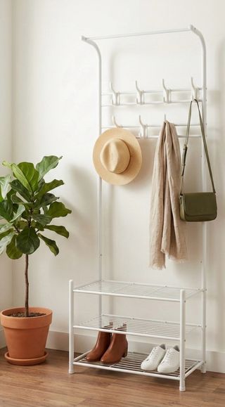 Práctico perchero de pie con zapatero integrado. Ideal para organizar tu entrada. - Estructura de metal resistente. - Dos baldas para zapatos. - Múltiples ganchos para abrigos y accesorios.
