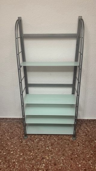 Elegante estantería con estructura de metal y baldas de cristal. - Diseño moderno y minimalista. - Cinco baldas amplias para almacenamiento. -Desmontable a la Mitad. Se encuentra en Ayora.
