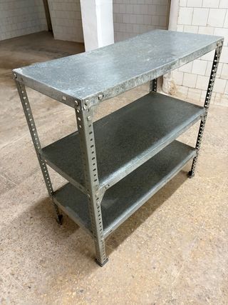 Estantería baja de metal con tres niveles. - Estructura robusta. - Diseño práctico y funcional.