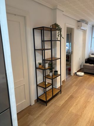 Estantería de diseño moderno con estructura metálica y baldas de madera. - Combinación de colores negro y marrón. - Materiales resistentes y duraderos. La estanteria está recién comprada, se vende montada y está sin uso ya que no nos cuadra con la decoración del salón (decoración no incluida)