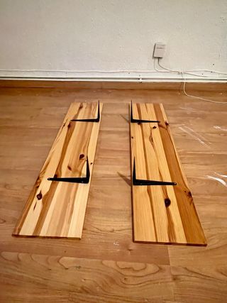 Conjunto de dos estanterías de madera maciza, listas para instalar. - Soportes metálicos en L incluidos. - Diseño rústico con vetas de madera visibles.