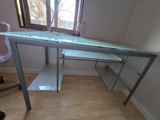 ESCRITORIO DE VIDRIO EN PERFECTO ESTADO. Cuenta con 3 estanterías y un cajón deslizable. Se hace precio al comprar con silla. Este escritorio combina un diseño moderno con materiales duraderos. - Superficie de cristal. - Estructura de metal.