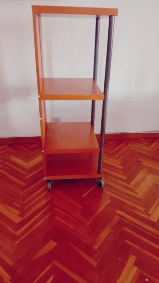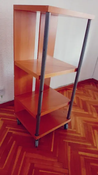 Práctica estantería de cuatro niveles con ruedas. - Estructura de metal. - Tableros de madera. - Ruedas para fácil movilidad. Medidas: altura total 91 cm ancho 42 cm fondo 35 cm