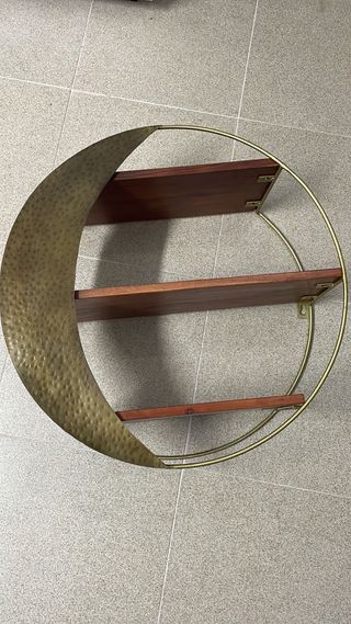 Estantería 55,5 x 25,5 x 9,5 cm no se ha usado ni comgado, con espejo circular integrado. Combina un diseño moderno con materiales de calidad. - Estructura metálica dorada. - Paneles de madera en tono marrón. - Espejo redondo.