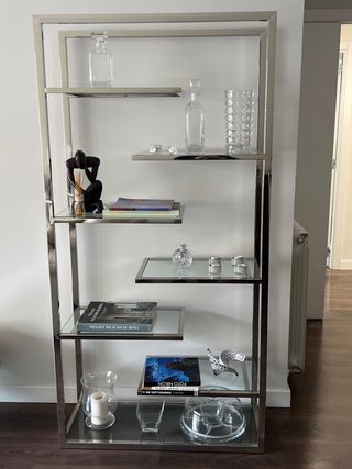 Elegante estantería con estructura de metal y baldas de cristal. - Diseño moderno y minimalista. - Combina a la perfección con cualquier decoración. - Ideal para exponer libros, objetos decorativos o plantas.