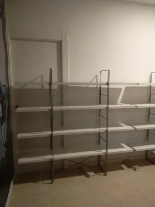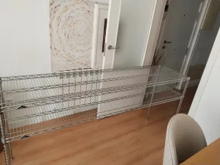 Conjunto de estanterías metálicas de color gris. Son robustas y prácticas para organizar. - Estructura de metal resistente. - Diseño de múltiples baldas. Precio de 35 a 50eur.