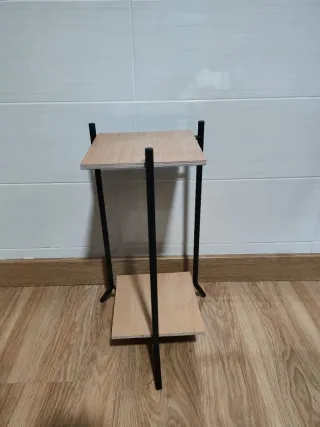 Estantería de dos niveles con un diseño moderno y elegante. Esta nueva un mes de uso - Estructura principal en metal negro. - Tableros de madera en tono marrón.