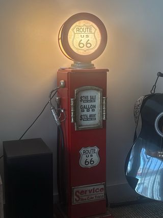 Original pieza decorativa con diseño de gasolinera Route 66. - Detalles en metal y plástico. - Acabado en rojo y dorado.