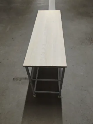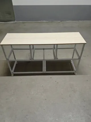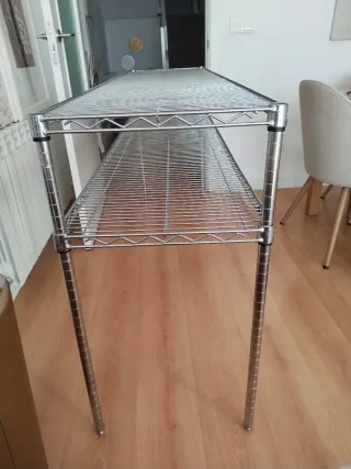 Estante con una superficie de madera y estructura metálica. - Medidas: 100 cm de largo, 30 cm de profundidad y 55 cm de alto. - se pueden poner cajas de tela, tablas para hacer estantes... No incluido. Entrega en mano en Zaragoza capital, si le interesa se lo acerco en un momento previo acuerdo de hora y lugar.