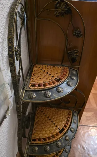 Elegante estantería de forja con detalles en mimbre. - Diseño de esquina de cuatro niveles. - Estructura metálica robusta. - Estantes con acabado en mimbre tejido.