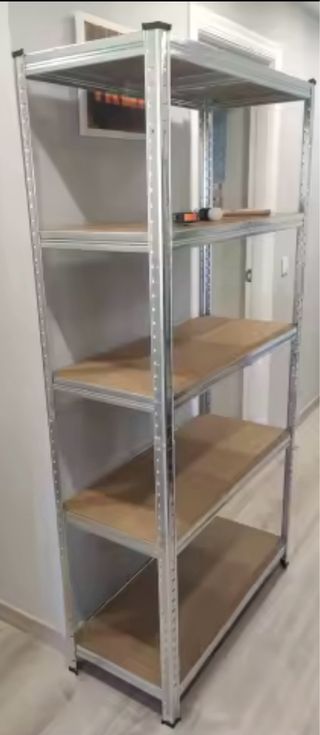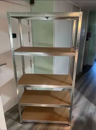 Estanterías metálicas nuevas de fácil montaje, ideal para organizar tu espacio. - Estructura robusta. - Cinco baldas de madera. - Diseño moderno y funcional.