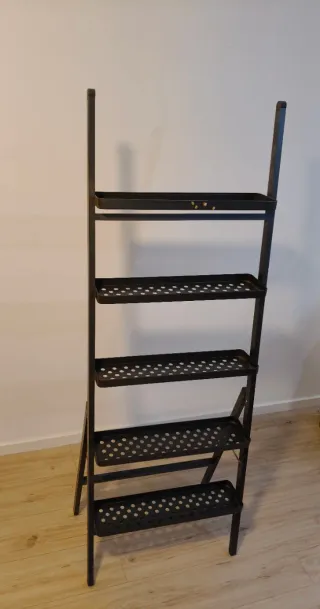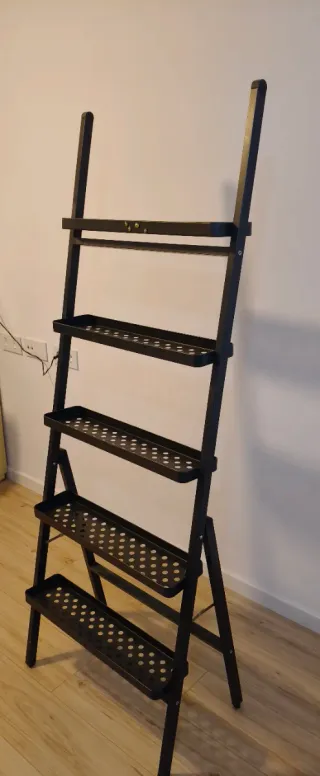 Elegante estantería negro grafito con diseño de escalera. - Estructura metálica resistente. - Cuatro niveles de bandejas perforadas. - Acabado negro mate. - Baldas de 10 cm de fondo Ideal para plantas.