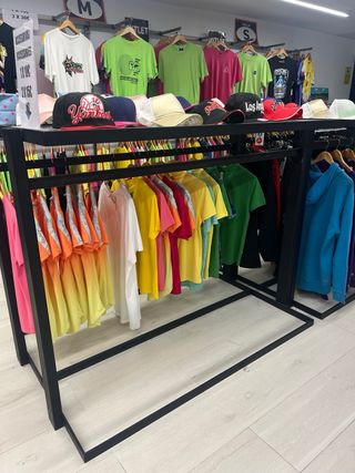 Mobiliario completo para montar una tienda de ropa y complementos con todo tipo de detalles: - Mostrador - Sistema de alarmas con etiquetas rigidas - Percheros de pared y percheros centrales - Vitrinas y estanterias de varios tipos - Impresoras de tickets, pantallas de tpv, cajones portamonedas, lectores de codigos de barra - Expositores para chanclas y gorras - Espejos, cortinas - Almacen completo con diferentes sistemas Todo muy cuidado y gran variedad de modelos Precio a convenir, segun el lote de productos