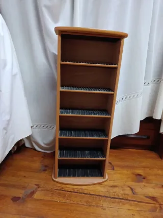 Se vende esta práctica torre para almacenar CDs. Está en buen estado y es perfecta para organizar tu colección musical. - Capacidad para numerosos CDs. - Diseño elegante en tonos madera y negro. - Estructura robusta y estable.