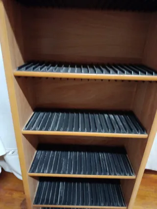 2 estanterías de madera con varios compartimentos, ideal para organizar tu colección de CDs. - Diseño de madera natural. - Múltiples divisiones para una mejor organización. -Espacio para unos 100 CD's en cada estanteria -117x17x17cm -25€ cada una. Las dos 40€