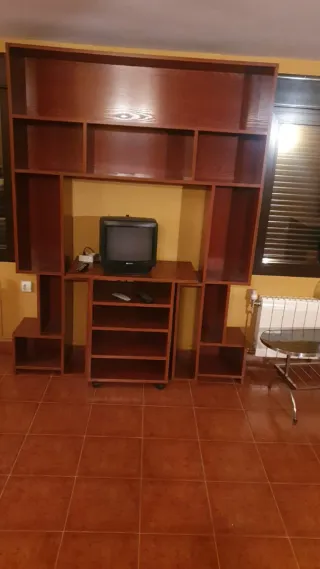 Mueble de salón con estantería y soporte para TV extraíble. 205x150x33 Recoger en Caraquiz - Estructura principal de madera. - Compartimentos de almacenamiento para libros, CDs, DVD, etc. - Diseño funcional.