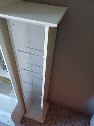 Estantería de madera para organizar tus CDs. Tiene tres estantes y compartimentos para guardar tus discos. Está en buen estado. Tiene ruedas. Se vende sin los CDs, están a modo de prueba visual. Largo 47,5cm Fondo: arriba 28cm abajo 33cm Alto 90cm