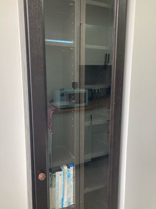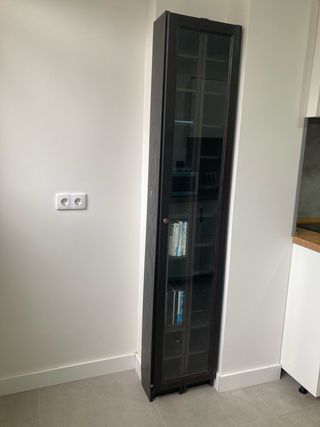 armario para almacenar cd’s y dvd’s. con baldas regulables y puerta de cristal. Color madera oscuro. Alto 200cms, ancho 40cms y fondo 20cms. Tiene una marca en uno de los laterales, por el resto esta en muy buen estado.