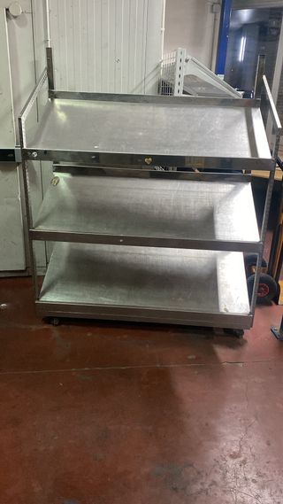 Estantería de acero inoxidable de tres niveles, ideal para fruterías o comercios. - Estructura robusta y duradera. - Bandejas amplias para exhibición. - Ruedas para fácil movilidad.