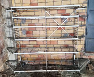 Vendo estanteria completa con todas las piezas y todas las bandejas. En las fotos estan las piezas. 5 estantes grandes 2 envellezor 5 cubre bandejas 2 pies 2 cubre pies largos de los lados 6 brazos todo de hierro chapado en blanco.