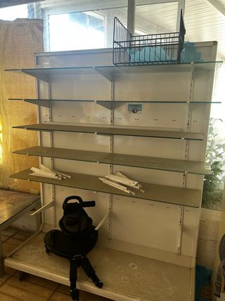 Estantería de tienda con estructura de aluminio y estantes de cristal. - Estructura metálica. - Estantes de cristal.