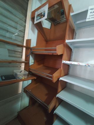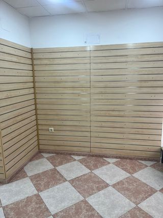 Conjunto de mobiliario para tienda. - Paneles de lamas de madera. - Estanterías metálicas. - Mostrador con dos cajones y sobre de cristal. -Mueble para escaparate - Los muebles están en Castellón