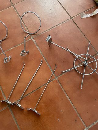 Variedad de ganchos para estanterías, perfectos para organizar y exhibir productos. - Incluye ganchos de diferentes formas y tamaños. - Diseñados para colgar artículos en paneles o rejillas. - Ideales para tiendas minoristas o almacenamiento.