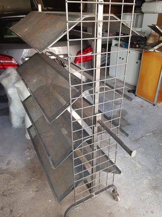 Expositor metálico con bandejas metálicas para objetos. Ideal para tiendas o talleres. - Estructura robusta. - Cajones en la parte inferior -Baldas superiores e inferiores -Ganchos para colgar productos Sólo venta en persona.