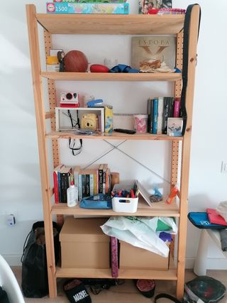 Estantería de madera de pino maciza de IKEA. Perfecta para organizar cualquier espacio. Semi nueva, y muy fácil de montar y desmontar. MEDIDAS: 89 ancho x 50 profundidad x 179 de alto. - Estructura robusta y resistente. - 5 baldas amplias y espaciosas. - Diseño sencillo y funcional. Su precio en tienda es de 107€.