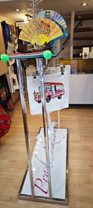 Expositor metálico azul para colgar bolsos ropa