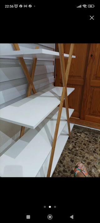 Estantería de diseño triangular con estructura de madera y baldas blancas. no le he podido dar utilidad porque es muy grande para el espacio que yo tenía reservado 🫢 confirmar bien las medidas!!!! En tienda 60 euros La vendo montada, es posible transportar en vehículo que tenga los asientos abatibles Es nueva recién comprada - Estructura de madera. - Baldas de color blanco.