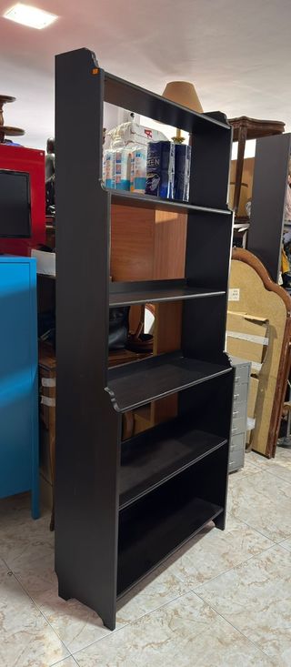 Estantería de madera en color negro, ideal para organizar libros y objetos decorativos. 👉📲622445668 - Diseño de líneas rectas y sencillas. - Múltiples baldas para almacenamiento. - Más artículos en mi perfil. LO ESPERAMOS EN LA TIENDA DE SEGUNDA MANO EL ÁGUILA 🦅 CALLE SIERRA DE ALBARRACÍN 4 CÓDIGO POSTAL 28053
