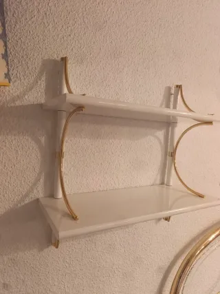 Estantería de pared blanca y dorada