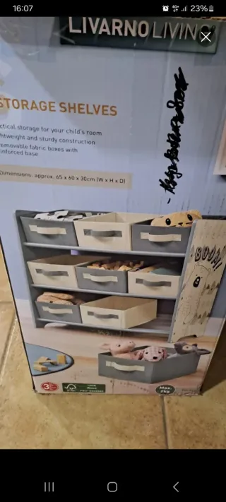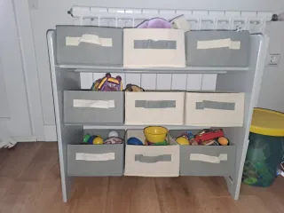 Práctica estantería para la habitación de los niños, con un diseño moderno y funcional. - Construcción ligera y robusta. - Incluye cajas de tela extraíbles. - Base reforzada para mayor estabilidad. - Dimensiones aproximadas: 65 x 60 x 30 cm (Ancho x Alto x Profundidad). Se vende ya montado