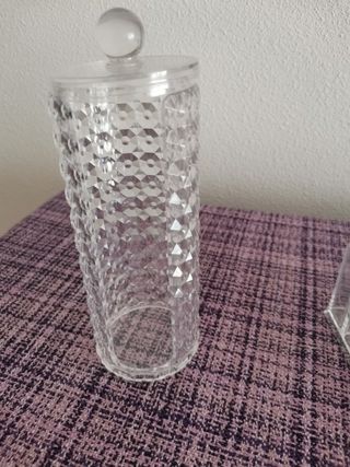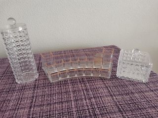 Juego de tres organizadores de baño de acrílico transparente. Son ideales para guardar tus cosméticos y artículos de aseo. - Diseño elegante y funcional. - Perfectos para mantener tu baño ordenado. - Incluye un dispensador de algodón, un organizador de maquillaje y una caja pequeña con tapa.