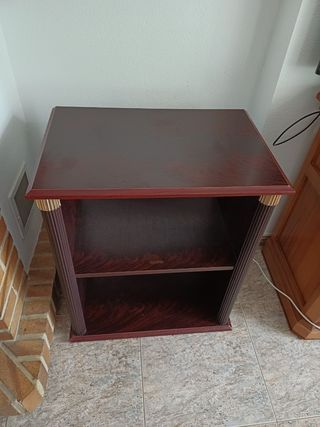 Mueble de madera oscura con dos estantes, ideal para libros o enciclopedias. Su diseño clásico y elegante se adapta a cualquier espacio. - Acabado en madera oscura. - Dos niveles de estantería. - Detalles dorados en los pilares.