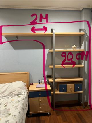 Mueble de escritorio con estantería integrada, ideal para dormitorio juvenil o zona de estudio. Tiene estructura muy sólida y funcional, perfecto para utilizar o restaurar con una capa de pintura. Gran oportunidad: Diseño Funcional: Incluye mesa, estantería de 3 niveles y cajonera inferior con 2 cajones. Gran Almacenaje: Espacio de sobra para decoración, libros, ordenador y material de oficina en un solo mueble... Potencial restaurar facil: Si te gusta el estilo nórdico, pintado en blanco queda espectacular (mira las posibilidades de diseño renovado en las fotos). Estado: Estructura firme, los cajones bien Medidas en las fotos.