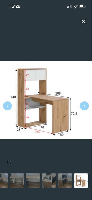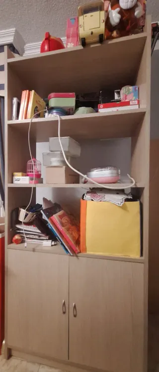 Mesa de escritorio con diseño en L y estantería integrada. - Estructura principal de madera. - Estantería superior con varias baldas. - Cajones inferiores para almacenamiento. - Mesa con agujero en la esquina para cables. En perfectas condiciones; se vende por cambio de habitación. Quién lo quiera debe saber desmontarlo...