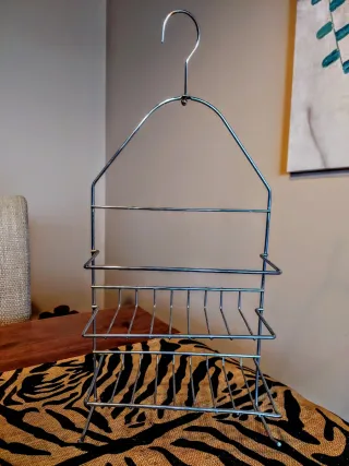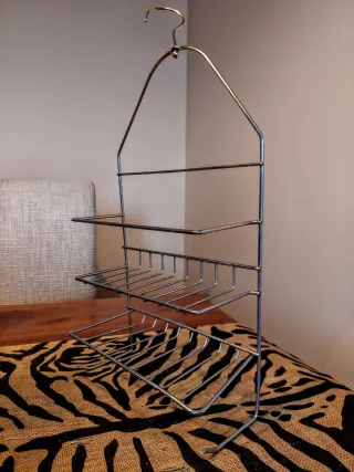 Estantería colgante de acero inoxidable para organizar tus artículos de ducha. - Diseño de tres niveles. - Colgador integrado para colgar en la mampara o frigo de ducha - Ideal para champú, jabón y otros accesorios. - Sus dimensiones son 41 x 22,5 x 9 cms