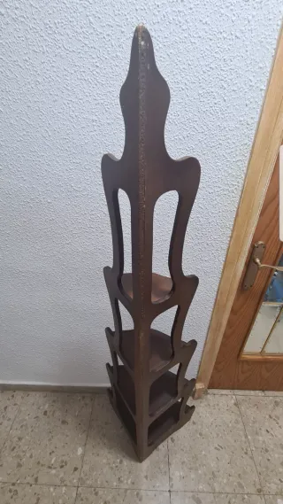 Elegante estantería de madera con un diseño de esquina. - Fabricada en madera. - Color marrón oscuro. - Diseño de cinco niveles.