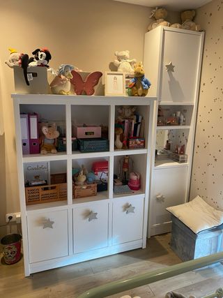 Conjunto de Estanterías modular para habitación infantil, con un diseño moderno y funcional. - Mueble blanco con detalles de estrellas. - Combina espacios abiertos y cerrados con puertas. - Ideal para organizar juguetes y libros. La estanteria estrecha mide ancho 50x fondo 30- altura 215