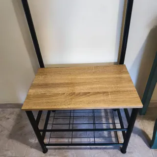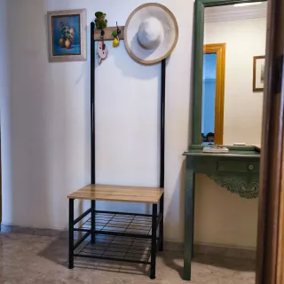 Práctico perchero con estantería, ideal para organizar tu entrada o habitación. - Estructura combinada de madera y metal. - Medidas: 60 cm de ancho, 176 cm de alto y 38 cm de profundidad.