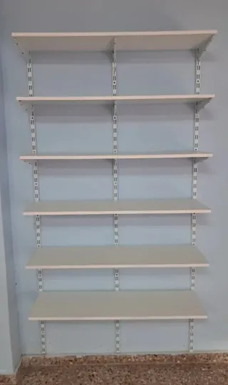 Conjunto de seis estanterías de pared. Se vendencm completas con todo, barras pared, escuadras, baldas - Estructura robusta. - Diseño moderno y funcional.