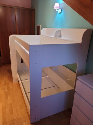 Se vende dormitorio infantil en color blanco. Incluye cama con otra que se saca aparador con cajones y estantería librería - Diseño moderno y funcional. Dos colchones de calidad en perfecto estado.