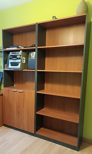 Dos estanterías en color cerezo con gris oscuro. Se pueden vender por separado. 60€ la que no tiene puertas y 90€ la que tiene puertas.