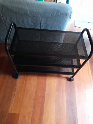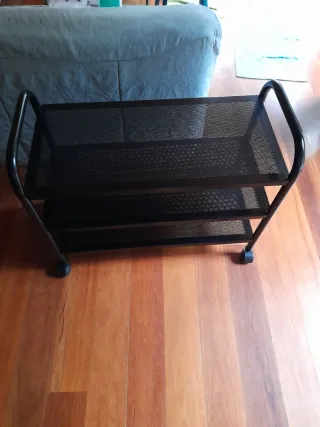 Estantería de dos niveles con un diseño moderno. - Estructura de metal. - Dos baldas con rejilla. - Ruedas para fácil movilidad que funcionan perfectamente. Tiene 4 marcas pequeñas en la balda superior. Solo venta en persona.
