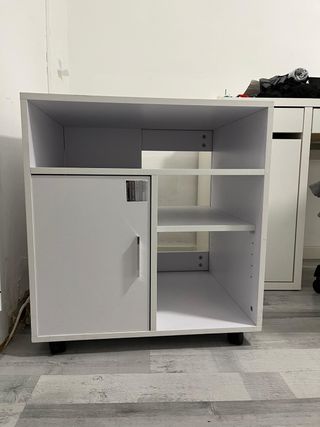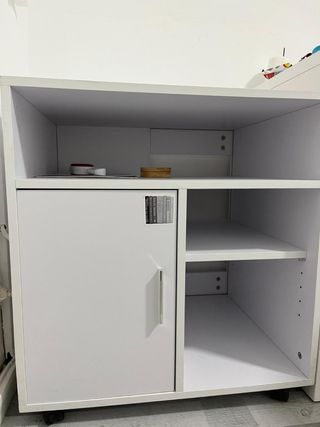 Mueble auxiliar con ruedas, ideal para organizar tu espacio. 60 x 65 alto x 50 profundidad - Cuenta con una puerta para almacenamiento. - Dispone de estanterías abiertas. - Fácil de mover gracias a sus ruedas.